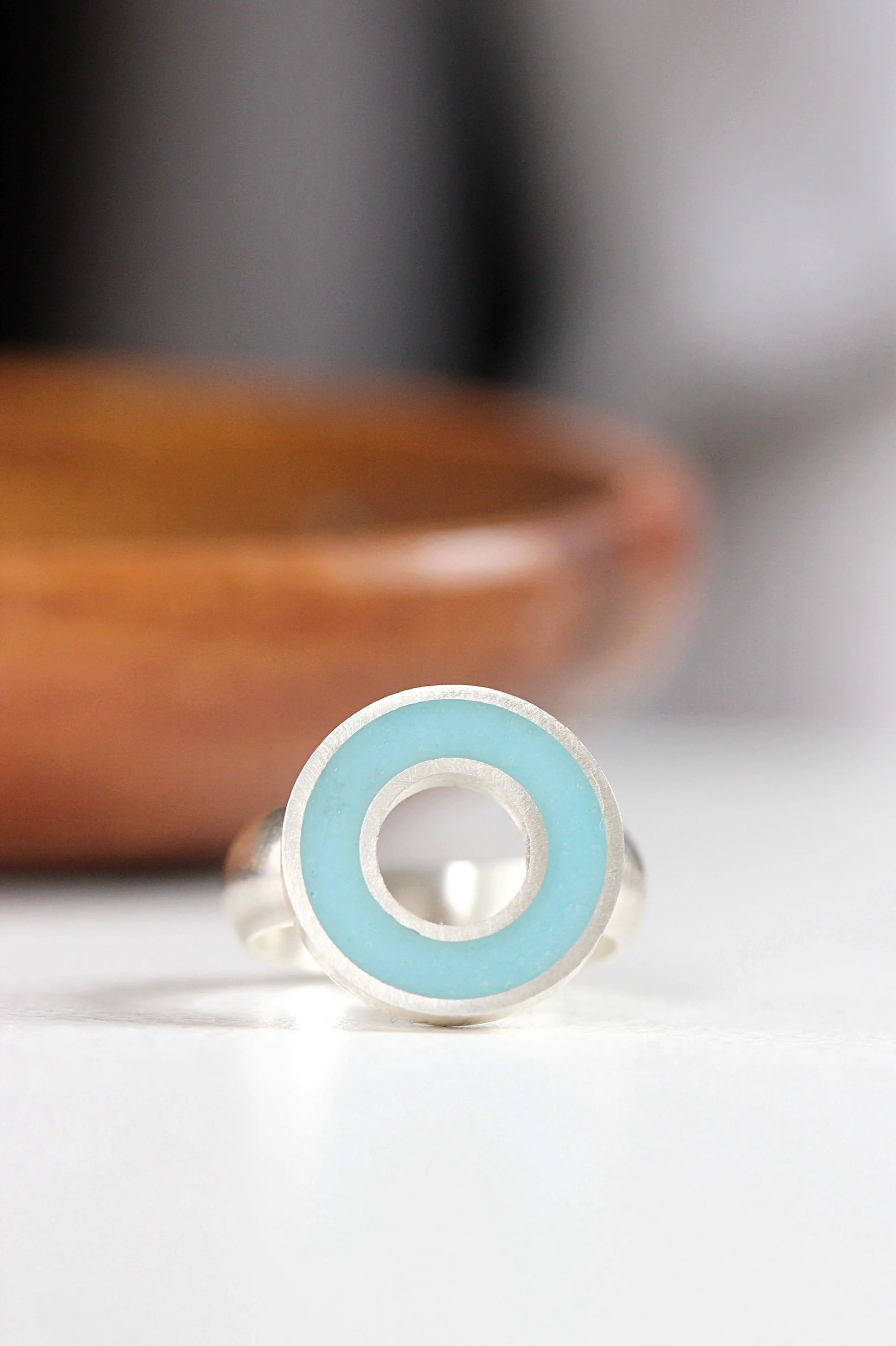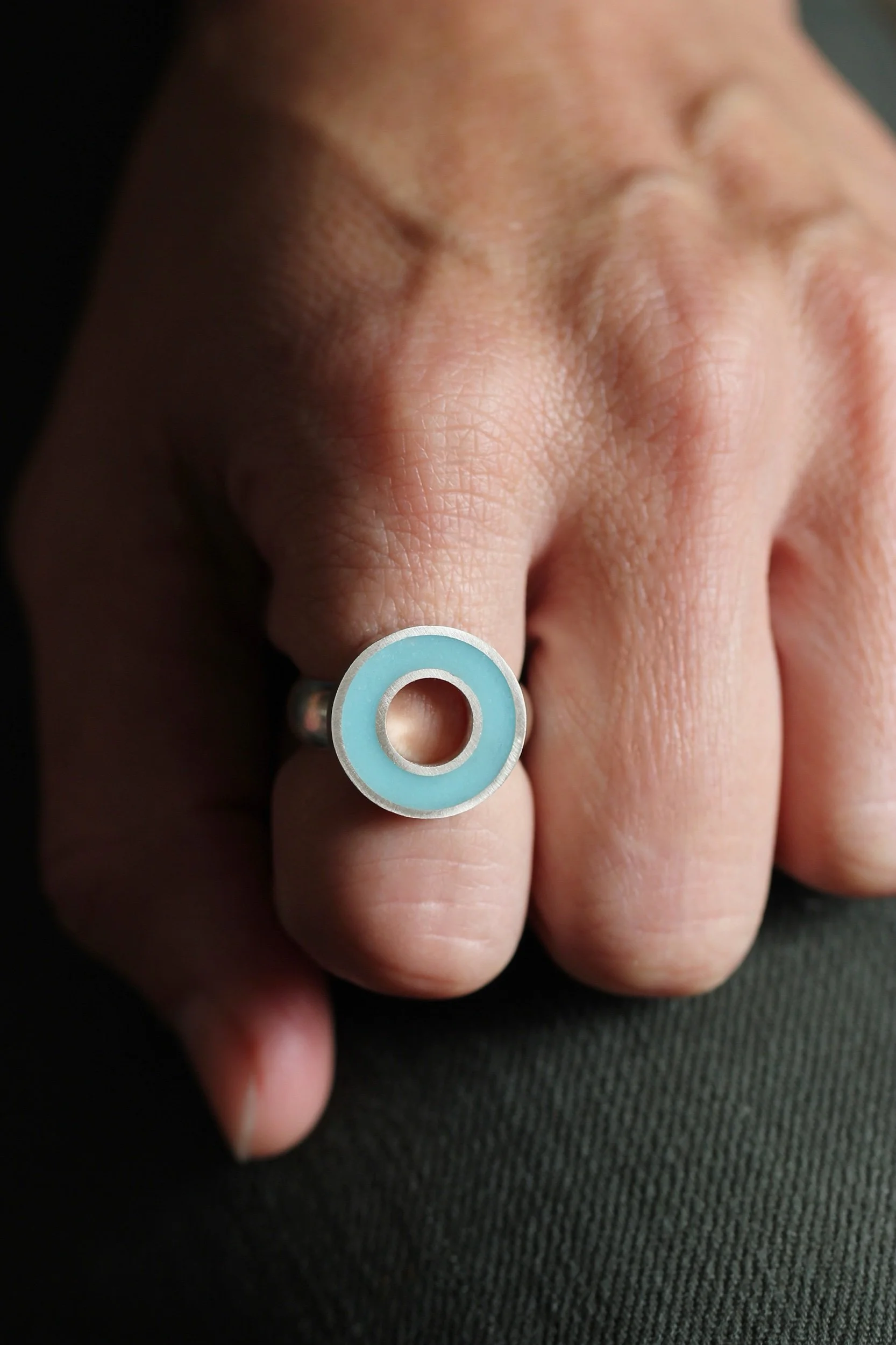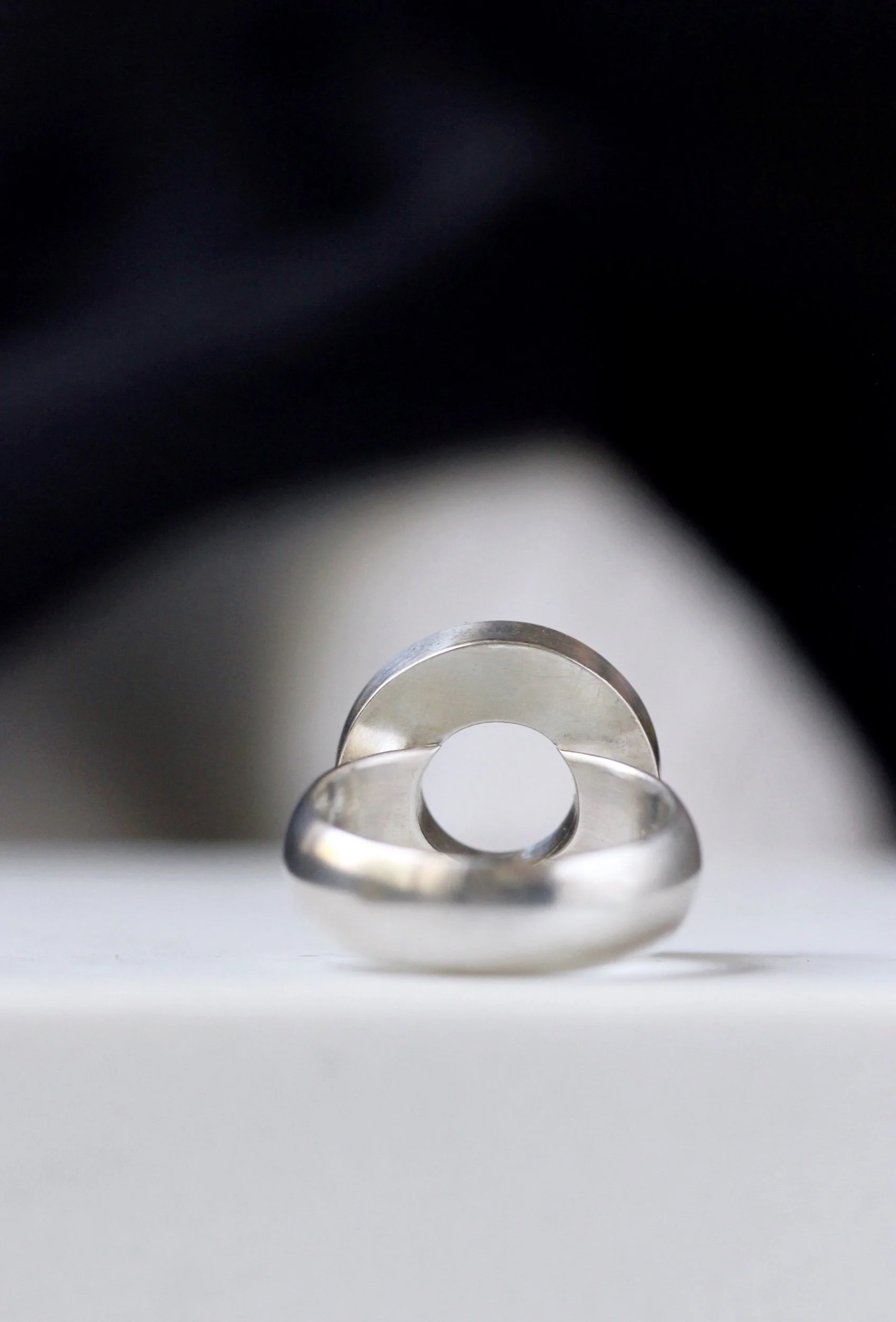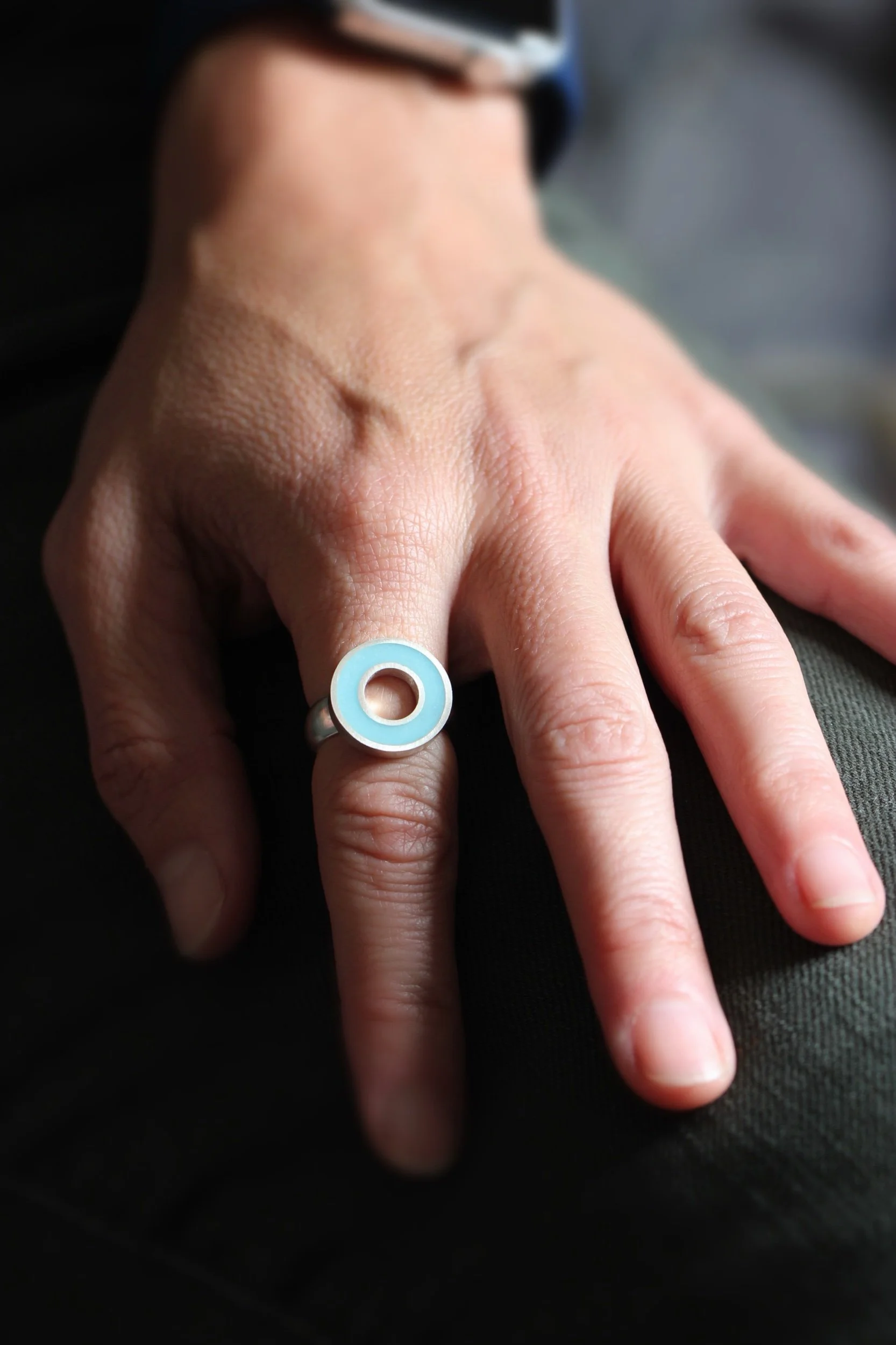 The top of this ring measures 5/8" in diameter by 1/8" thick with a 5/16" hole at its middle. It has a 1/4" wide low dome band.
