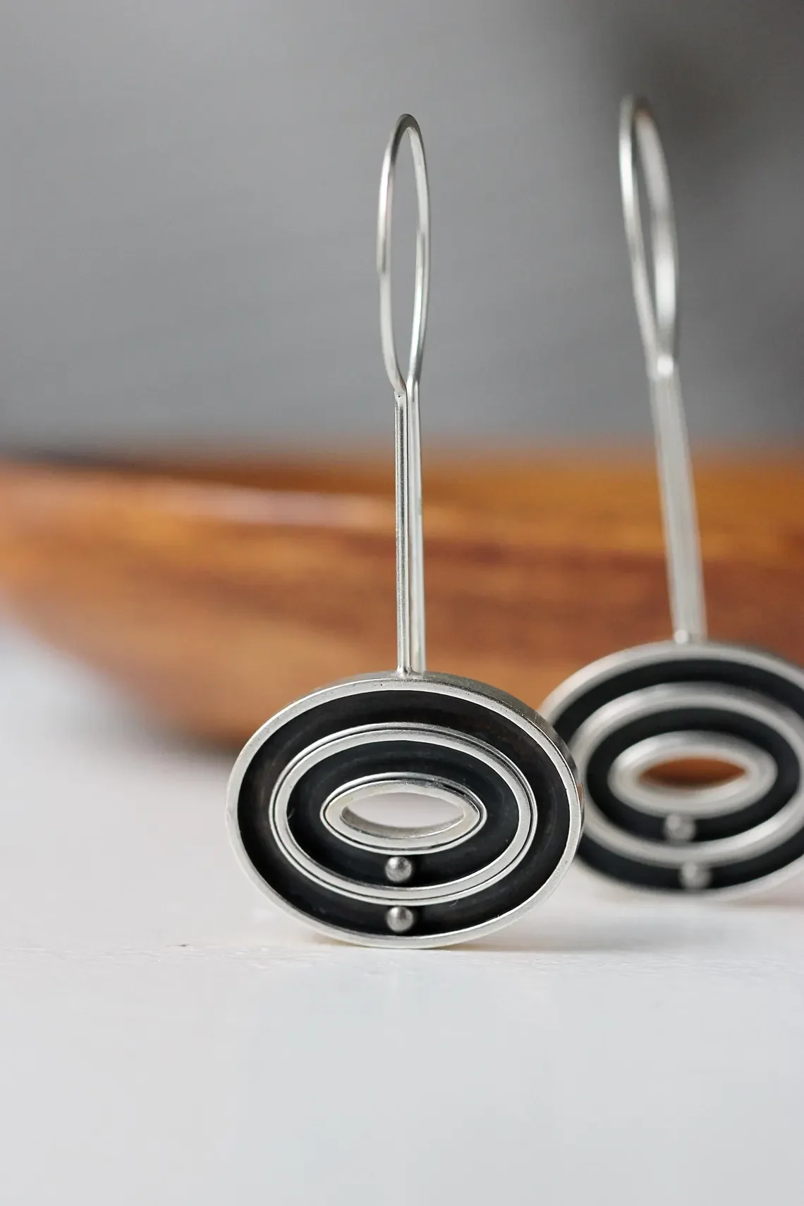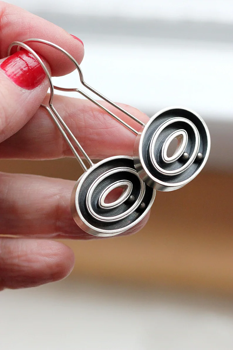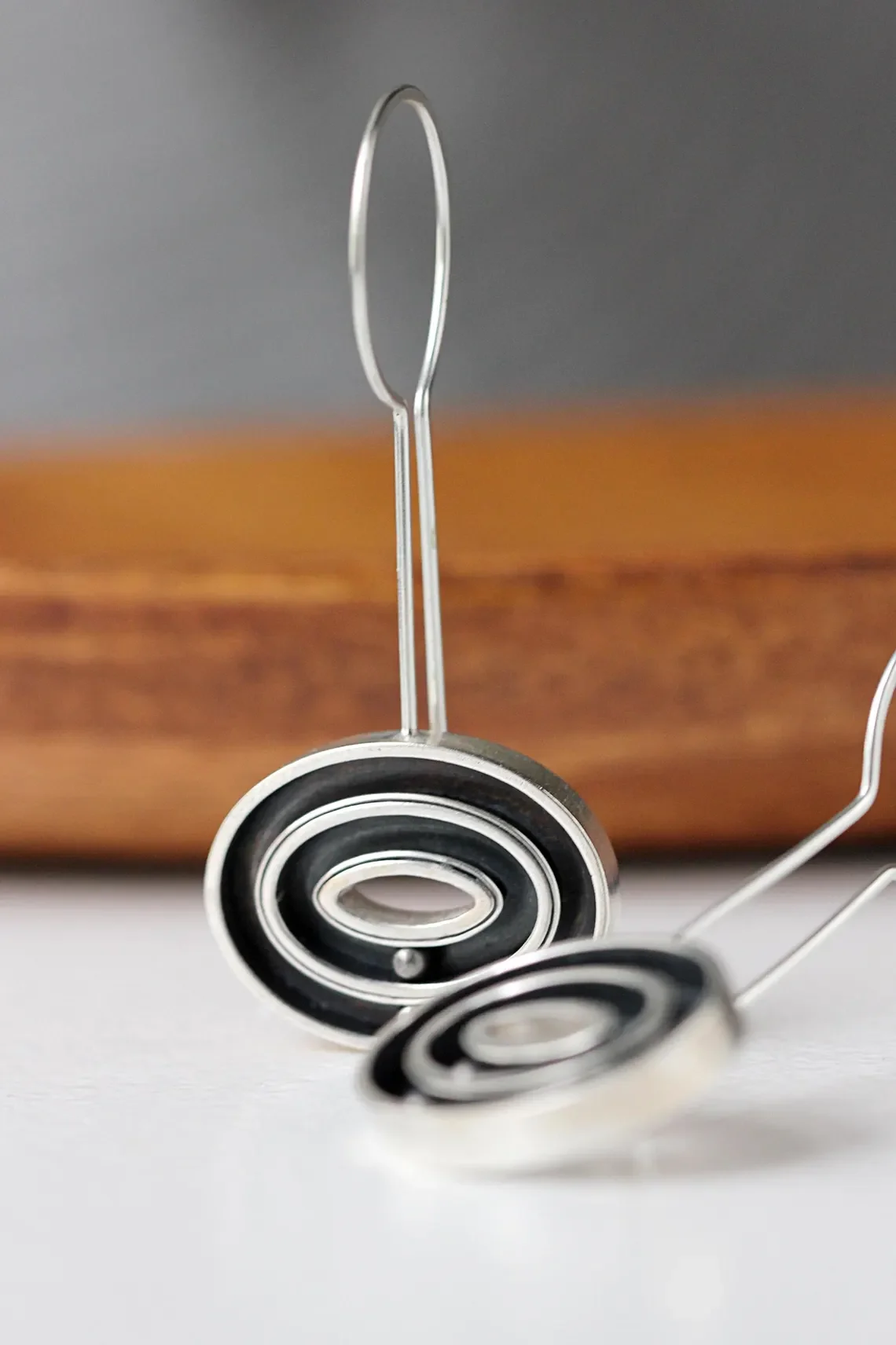 A new kinetic piece in my ongoing Round And Round series. This double-track earring pair is handcrafted completely of sterling silver. A stainless steel ball bearing is trapped within each channel, allowed to roll about freely without falling out. Approximately .75" in diameter. Hangs approximately 1.25" from the top of its wide, round earring wire.