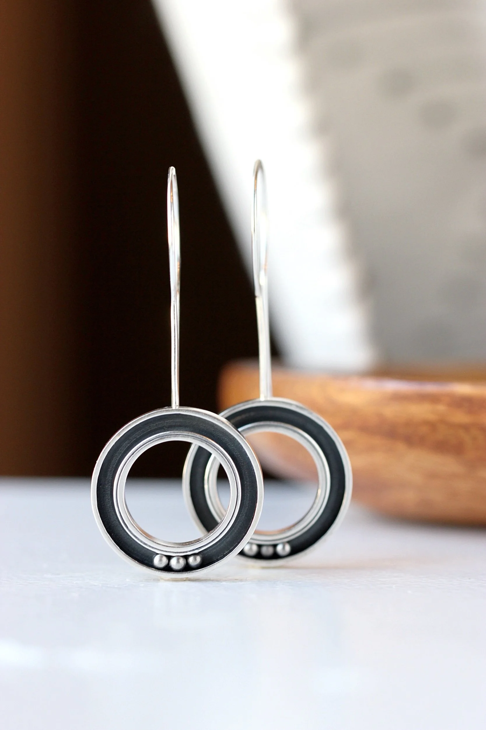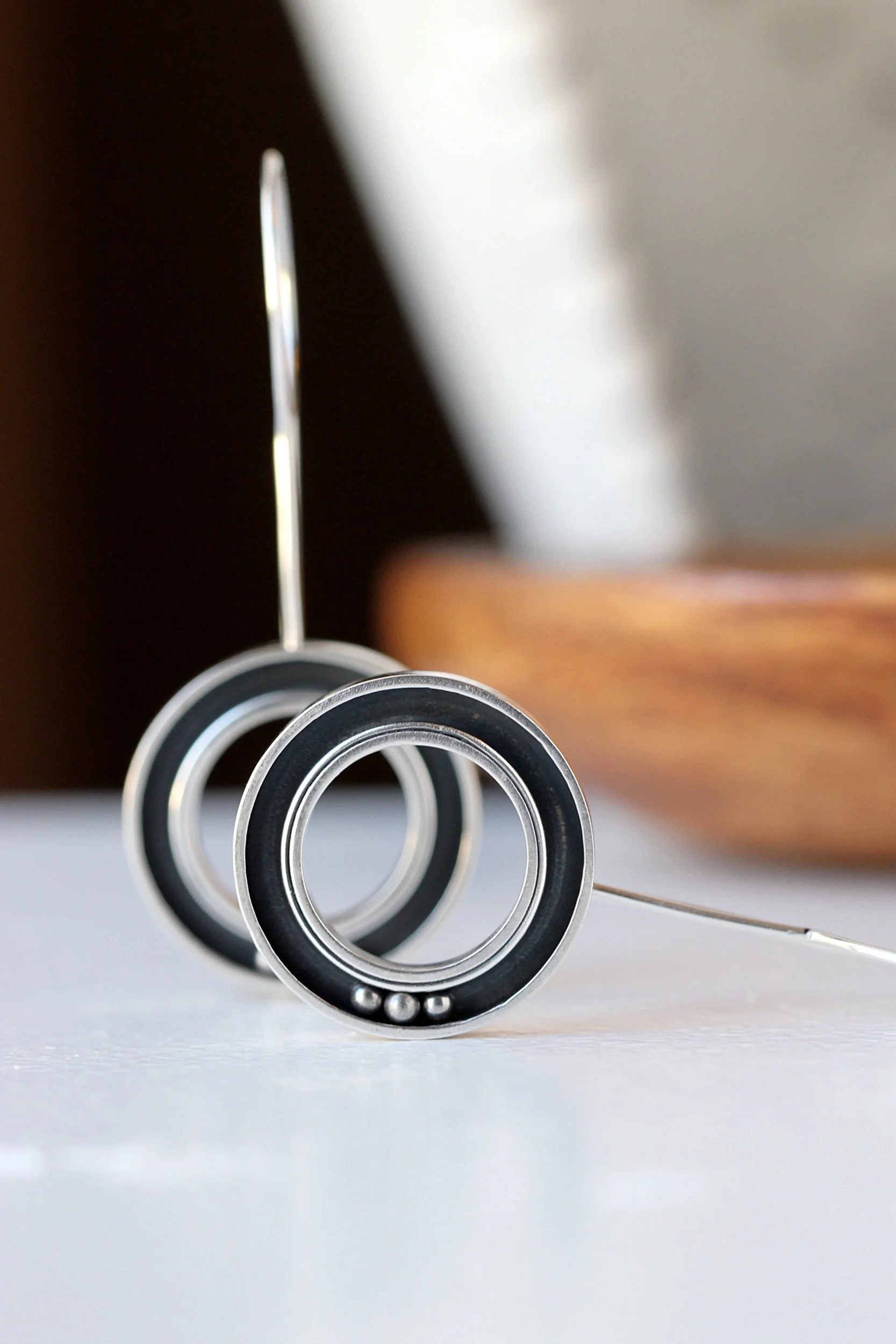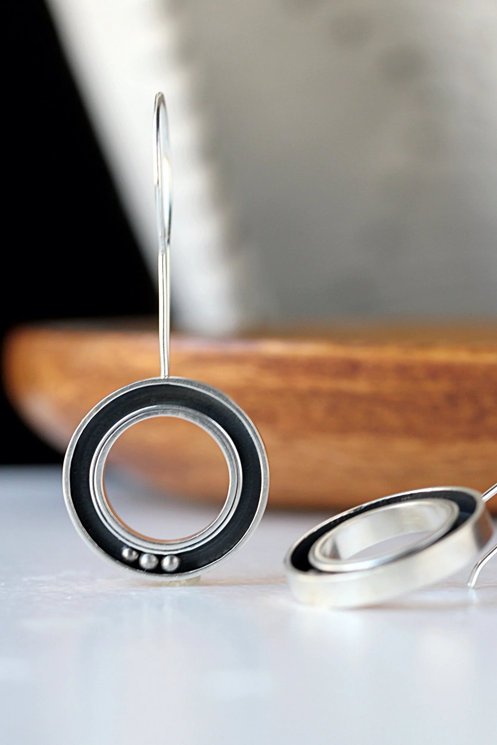 A new kinetic piece in my ongoing Round And Round series. This single-track earring pair is handcrafted completely of sterling silver. A stainless steel ball bearing is trapped within each channel, allowed to roll about freely without falling out. Approximately —" in diameter. Hangs approximately —" from the top of its wide, round earring wire.